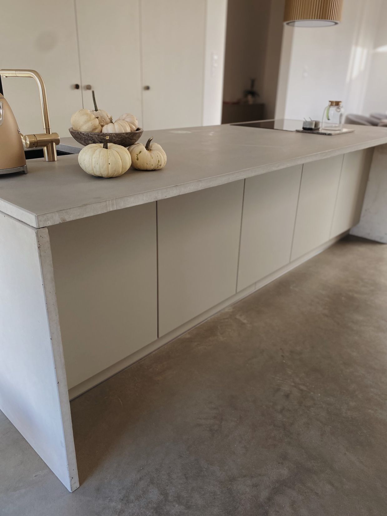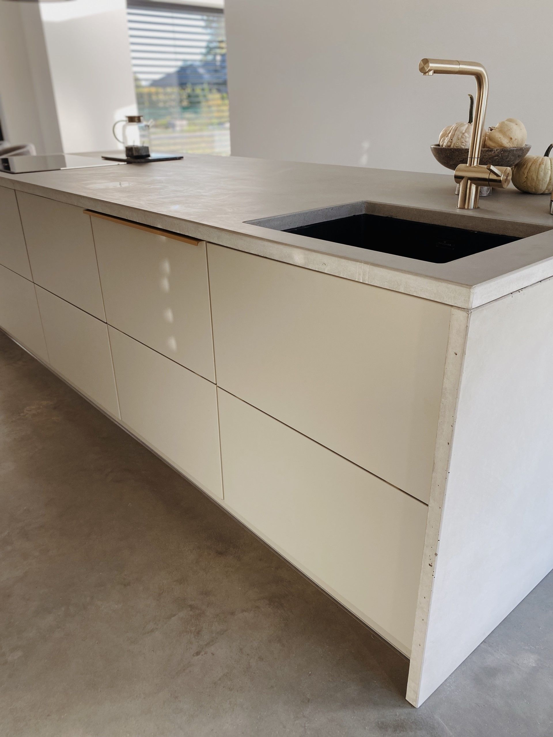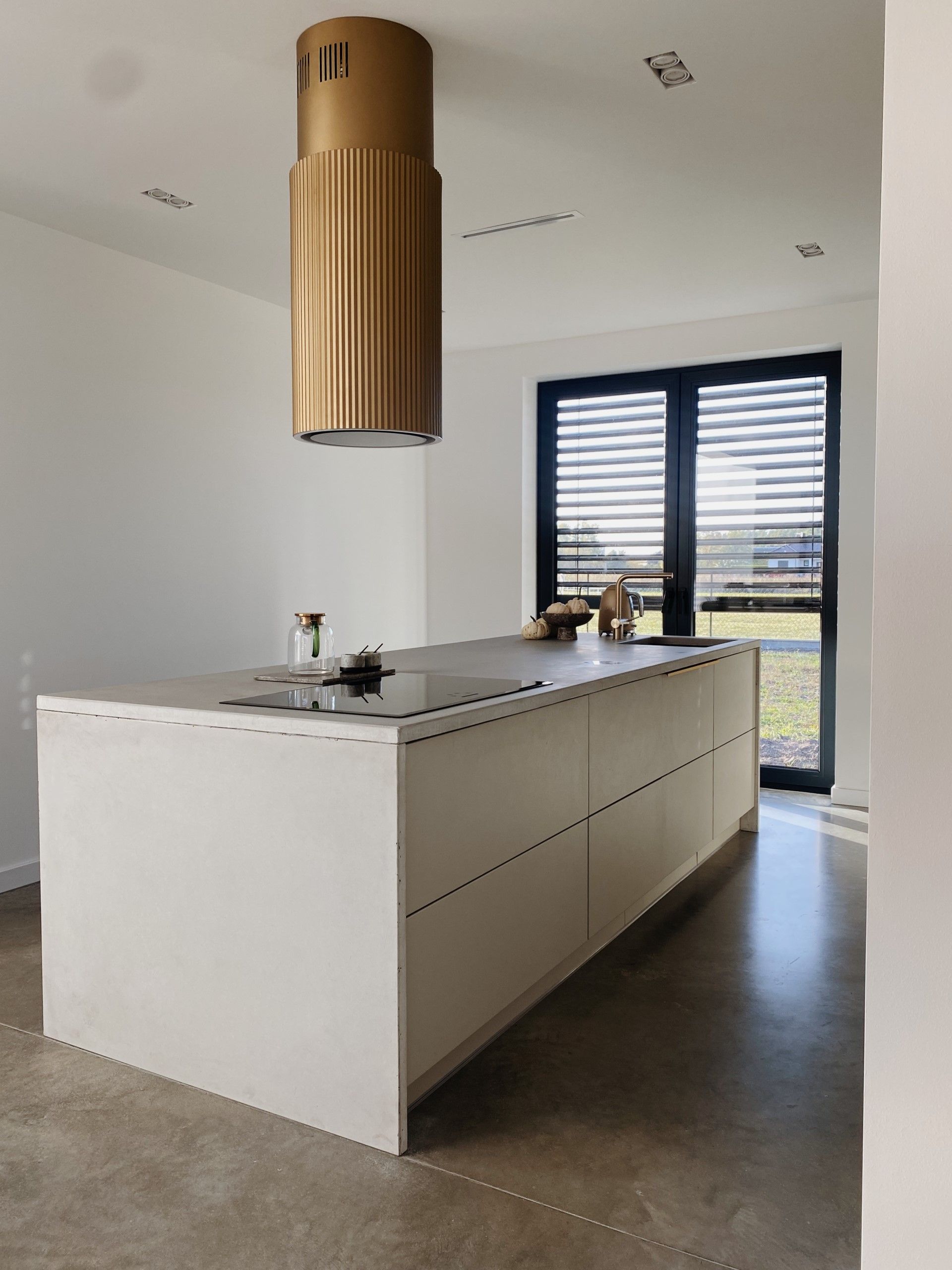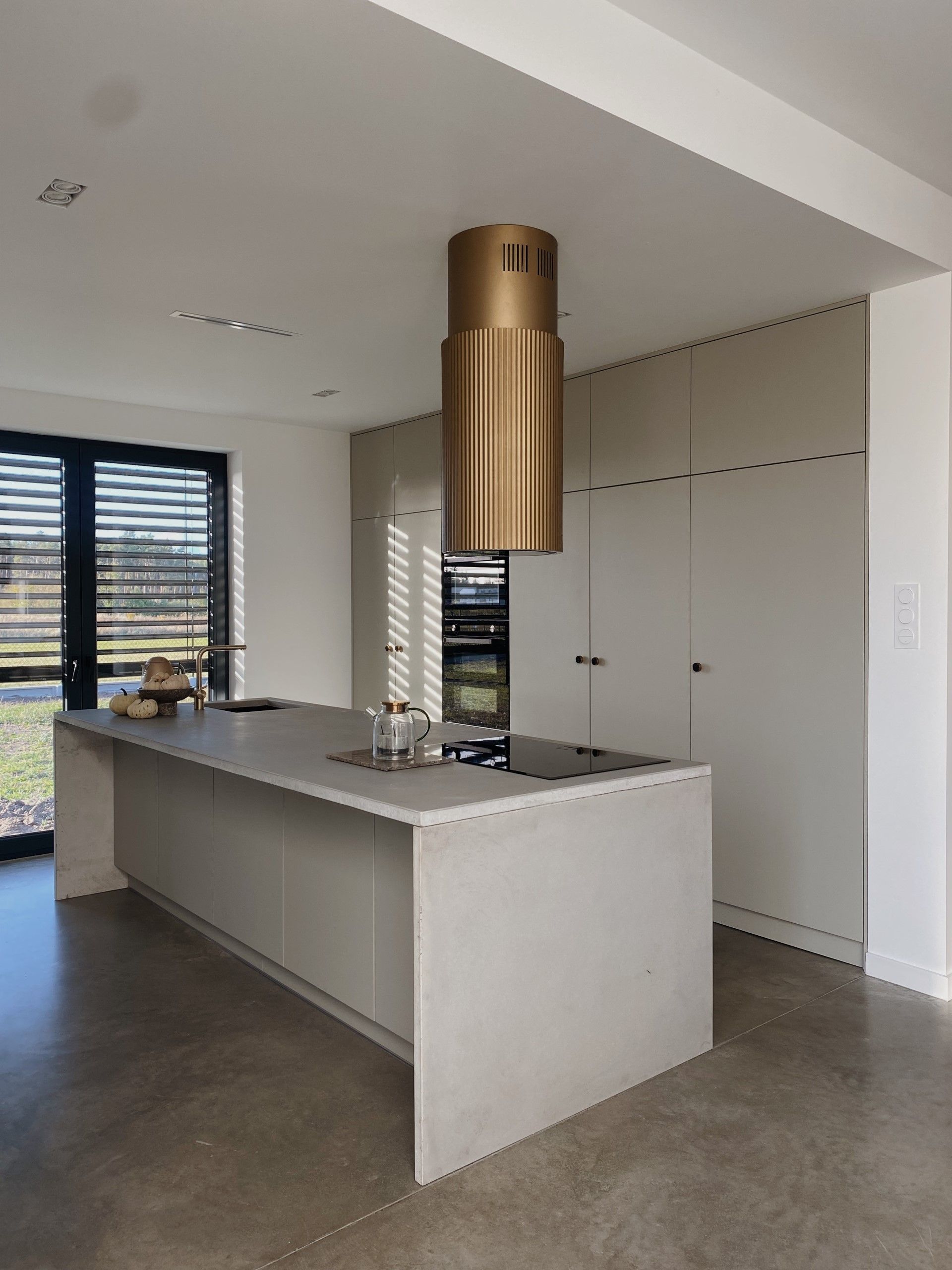 Na uwagę zasługuje również wolnowiszący, designerski okap Ciarko, którego złoty odcień dodaje luksusowego akcentu i przełamuje surową estetykę. Jasna przestrzeń, naturalne światło i spójność materiałów sprawiają, że ta kuchnia jest zarówno przytulna, jak i nowoczesna.