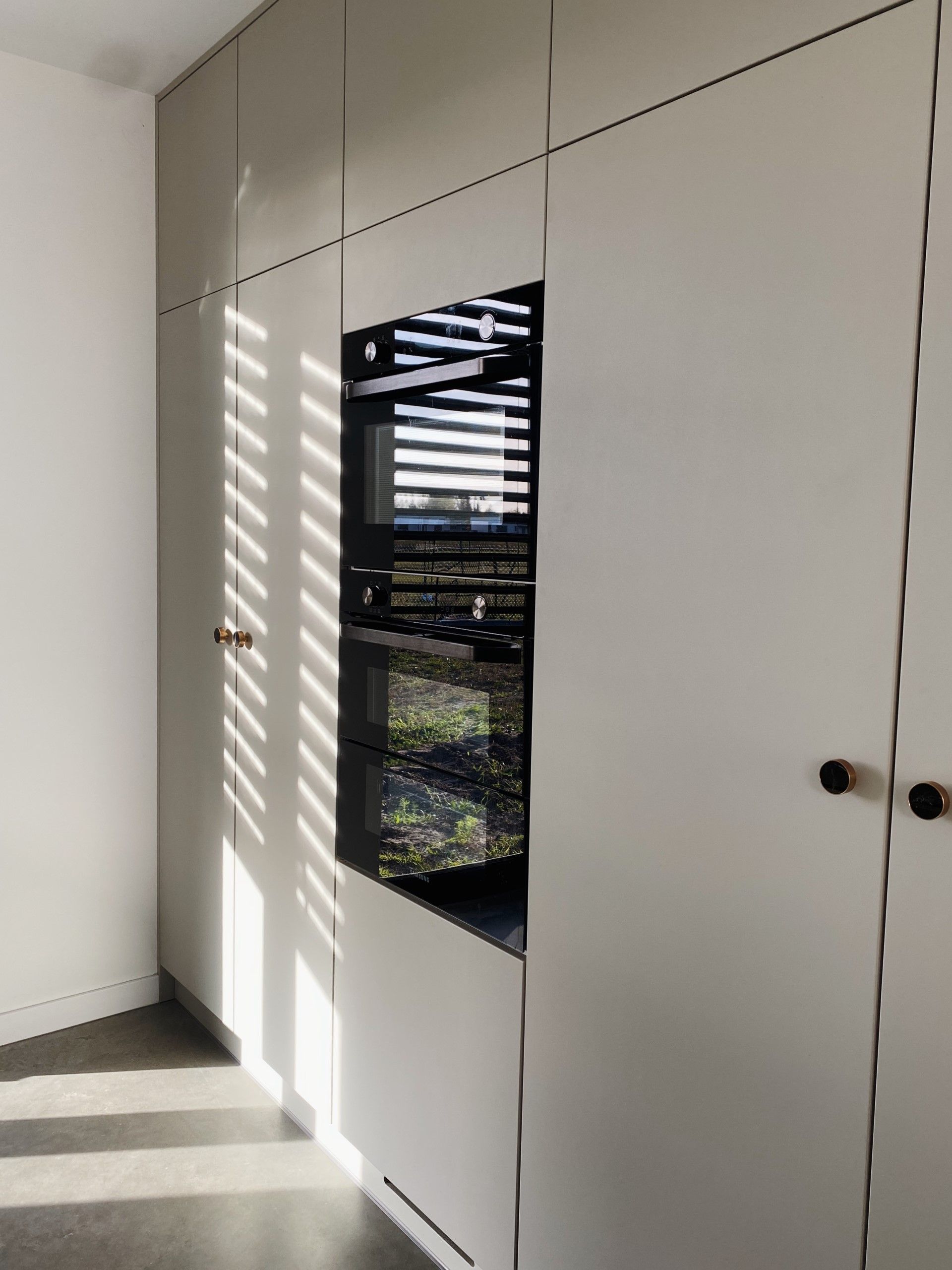Cała jedna ściana została zabudowana eleganckimi, gładkimi frontami w jasnym, neutralnym tonie – to rozwiązanie, które zapewnia ogromną ilość miejsca do przechowywania, a przy tym idealnie wpisuje się w minimalistyczną koncepcję projektu.